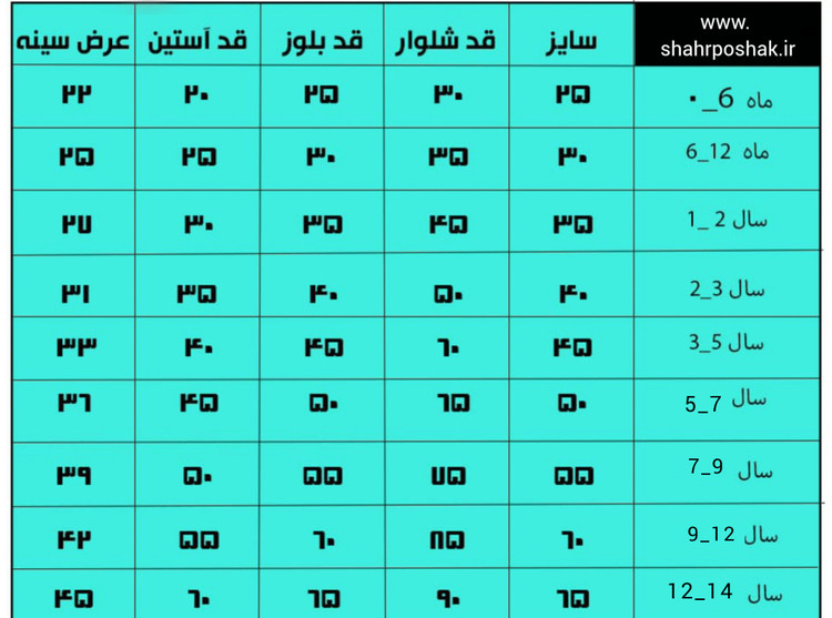 اندازه بلوز و شلوار بچه گانه برحسب سانتیمتر
